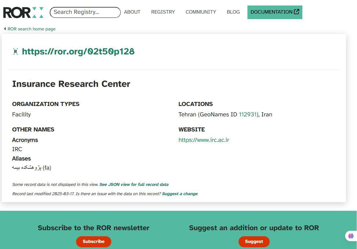 برای مشاهده صفحه رسمی پژوهشکده بیمه در سامانه ROR، به لینک زیر مراجعه نمایید: